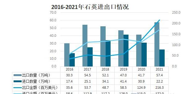 我國石英出口量較大,進(jìn)出口量差距逐步拉大。2021年,我國出口石英57.4萬噸,較2020年增加38%,出口金額為216.3百萬美元,我國進(jìn)口石英22.2萬噸,同比下降28%,進(jìn)口金額為172百萬美元。
