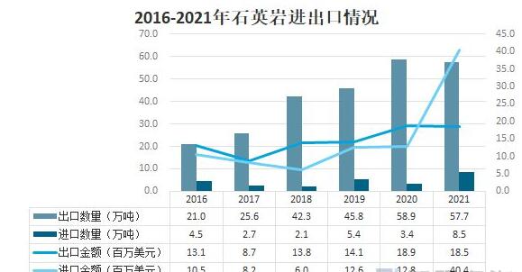 我國石英巖出口量遠(yuǎn)超進(jìn)口量,出口金額卻低于進(jìn)口金額。2021年,我國出口石英巖57.7萬噸,出口金額為18.5百萬美元;進(jìn)口石英巖8.5萬噸,進(jìn)口金額達(dá)40.4百萬美元。